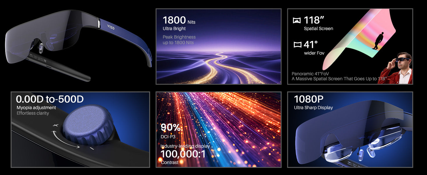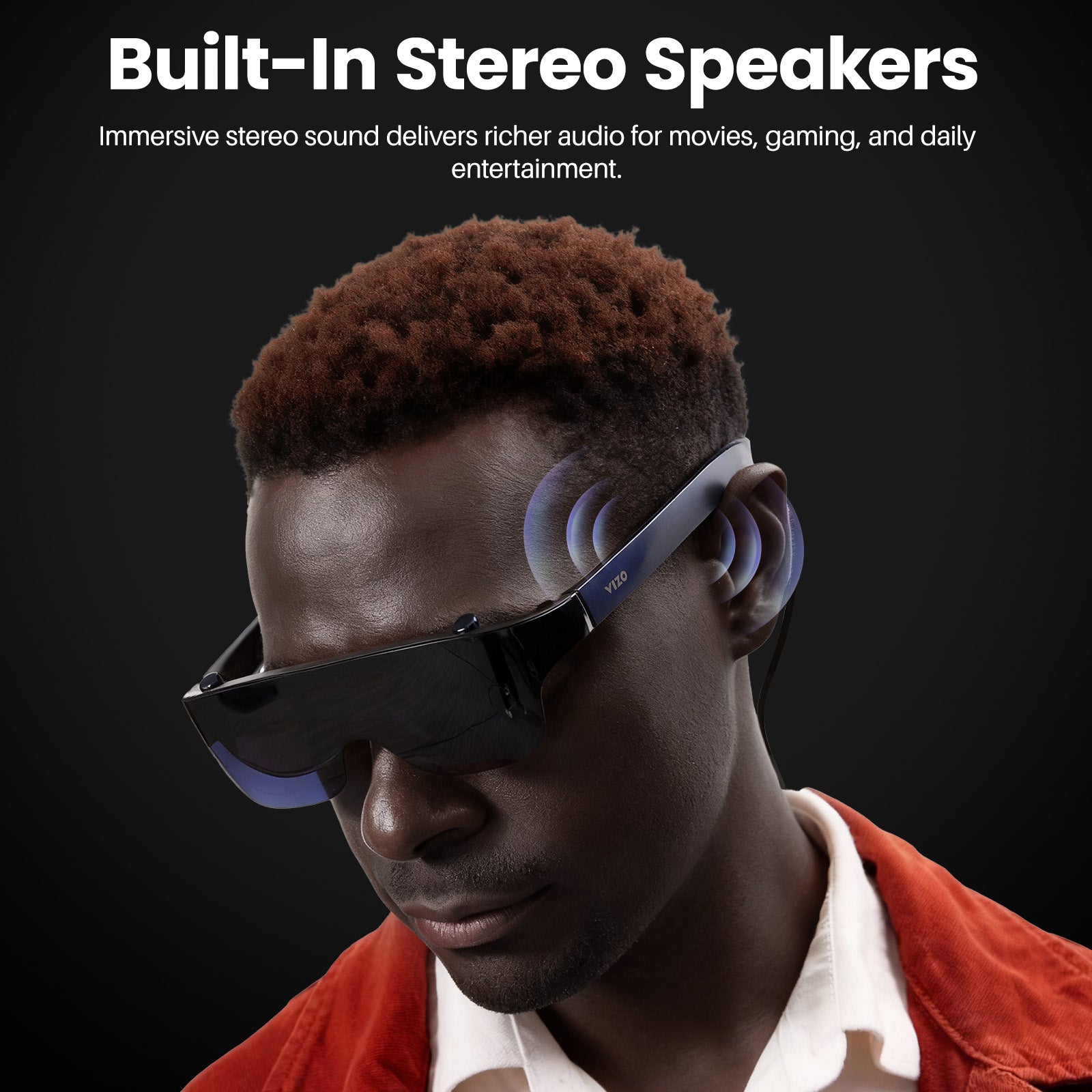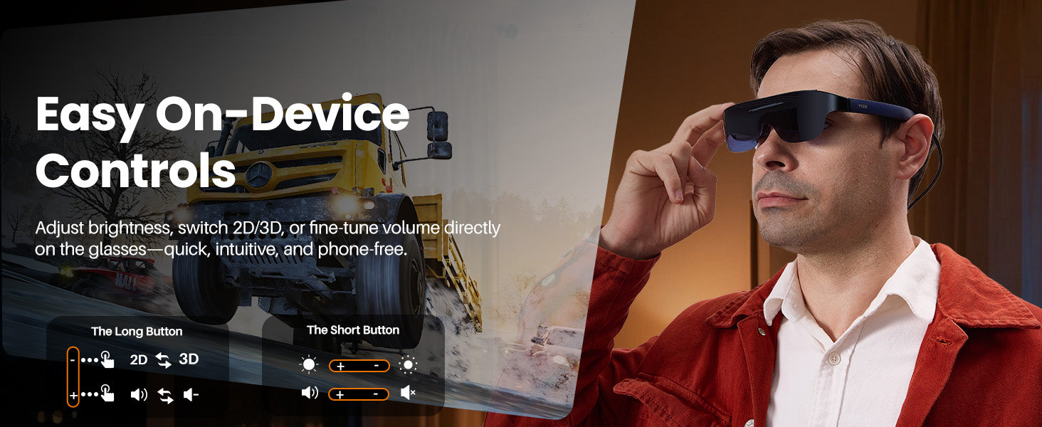 The VIZO V1 features easy on-device controls. You can adjust brightness, switch between 2D/3D modes, or fine-tune the volume directly on the glasses themselves. This provides quick, intuitive, and phone-free operation.