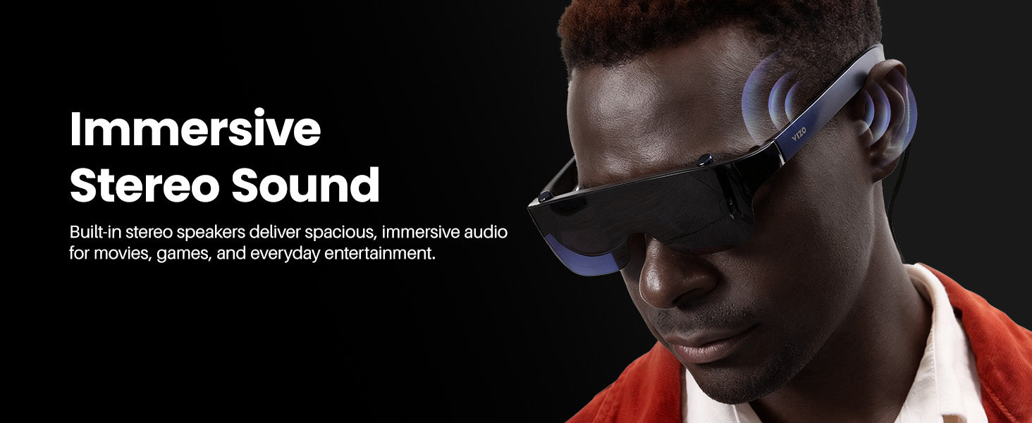 No. The VIZO V1 has built-in stereo speakers that deliver spacious, immersive stereo sound. This provides richer audio for movies, gaming, and everyday entertainment without the need for additional headphones.