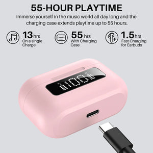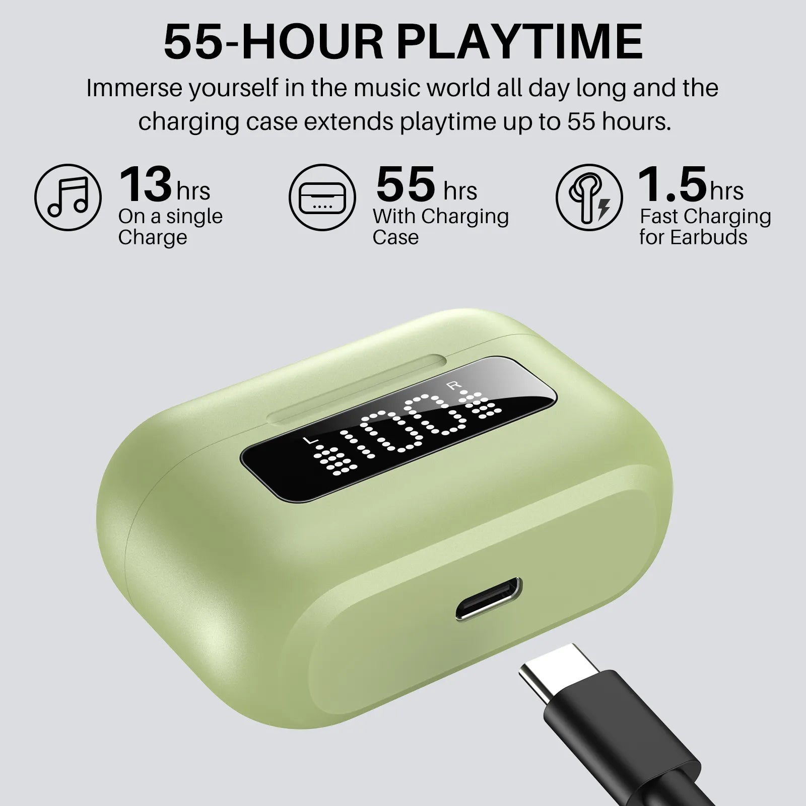 ケースを完全に充電すると、TOZO NC3 は最大 55 時間の再生が可能です。さらに、イヤホンは急速充電に対応しているため、急速充電するだけで何時間も再生できます。