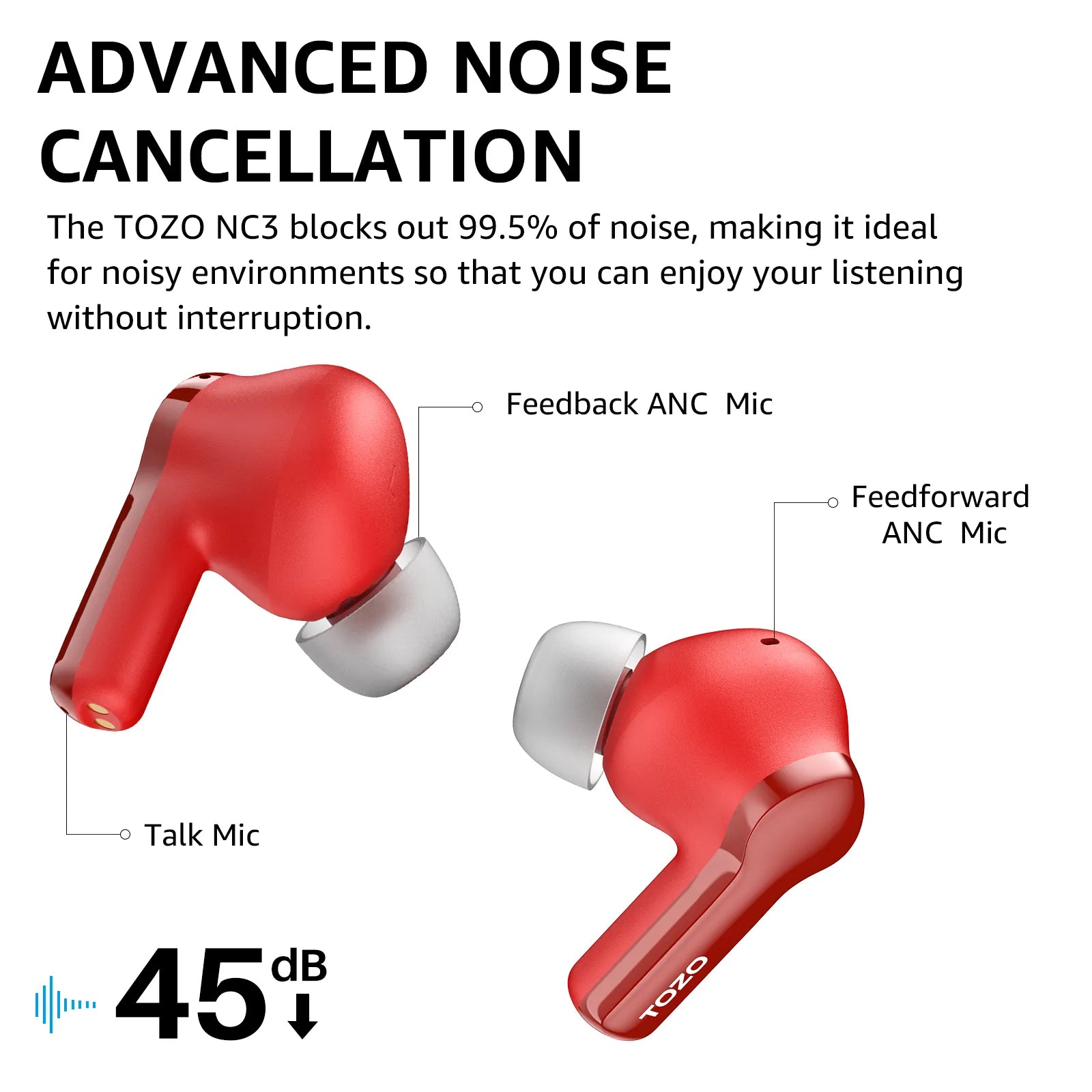 TOZO NC3は、3つの内蔵マイクを使ってノイズキャンセリングをリアルタイムでインテリジェントに調整し、周囲の環境に合わせて最適化します。モードを簡単に切り替えられるので、どこにいても、パーソナライズされた快適で没入感のあるリスニング体験をお楽しみいただけます。