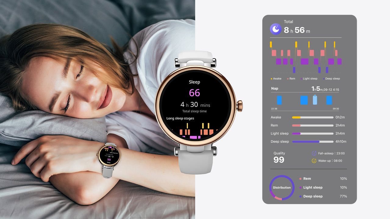 Enjoy vibrant colors and sharp details on the 1.32'' AMOLED screen. With ultra-thin bezels and 466×466 resolution, every glance feels fresh and beautiful.