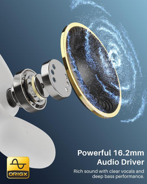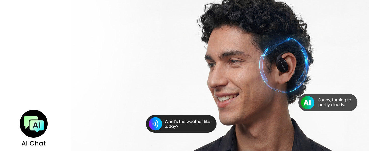 The TOZO OpenEgo AI Earbuds features an open-ear design for comfort, air conduction technology for clear music, Bluetooth 5.3 for a stable connection, dual-mic DNS for call noise cancellation, and 16.2mm dynamic drivers for high-quality sound.