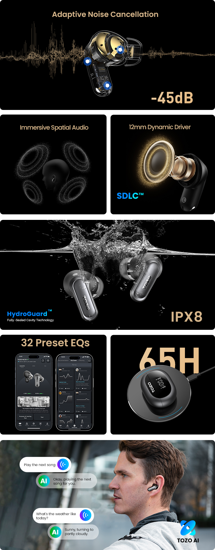With real-time noise monitoring and intelligent adjustment, enjoy deep noise reduction of up to 45dB for pure, immersive sound.