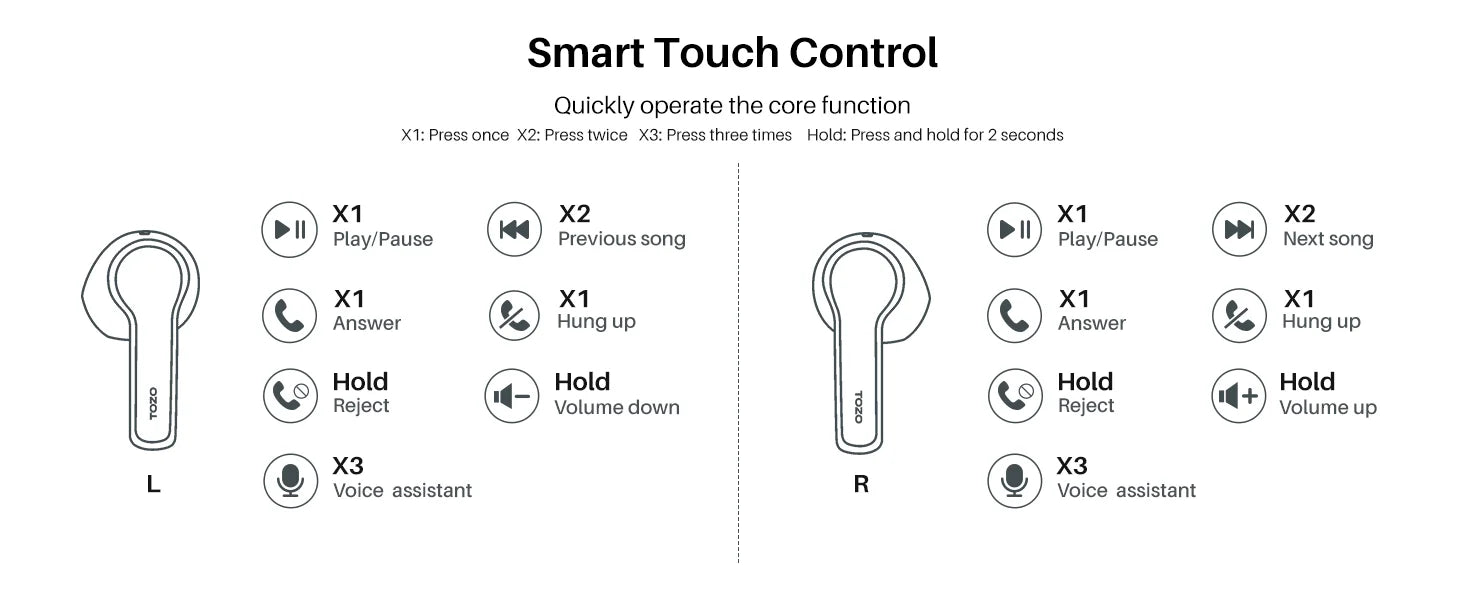 Pick up 2 headsets from the charging case and they will connect each other automatically. Then only one step easily enter mobile phone's Bluetooth setting and choose "TOZO-A3" to pair the earbuds.