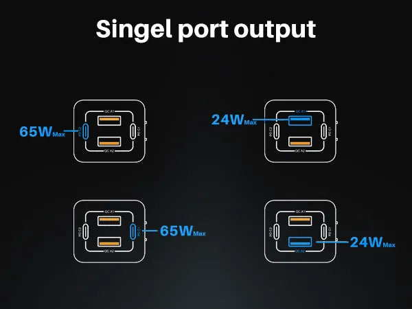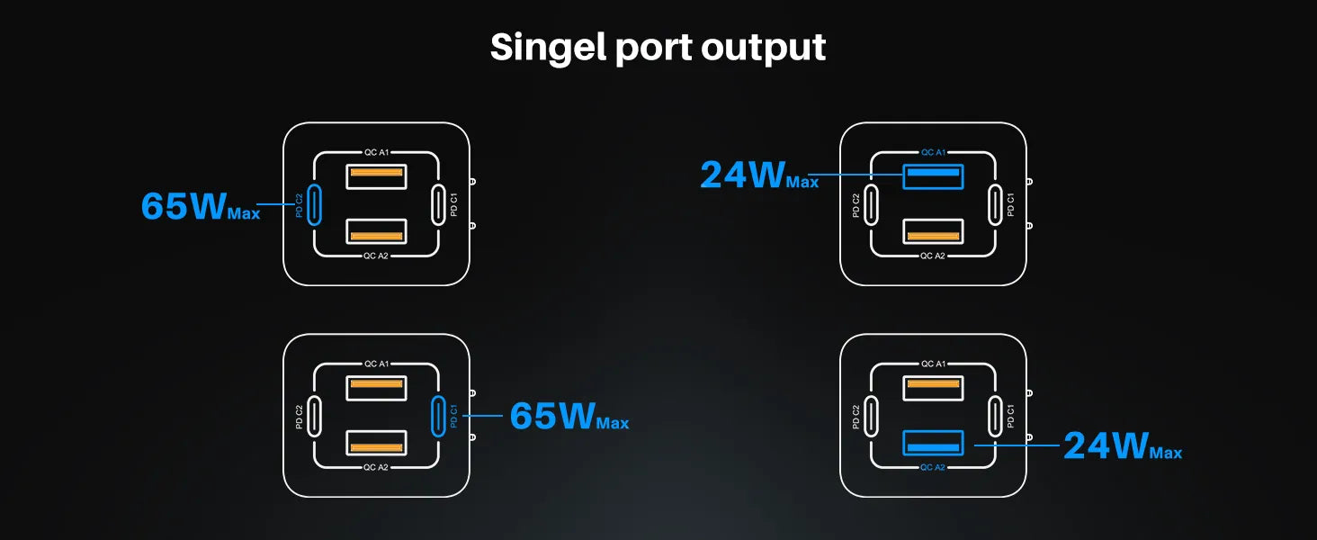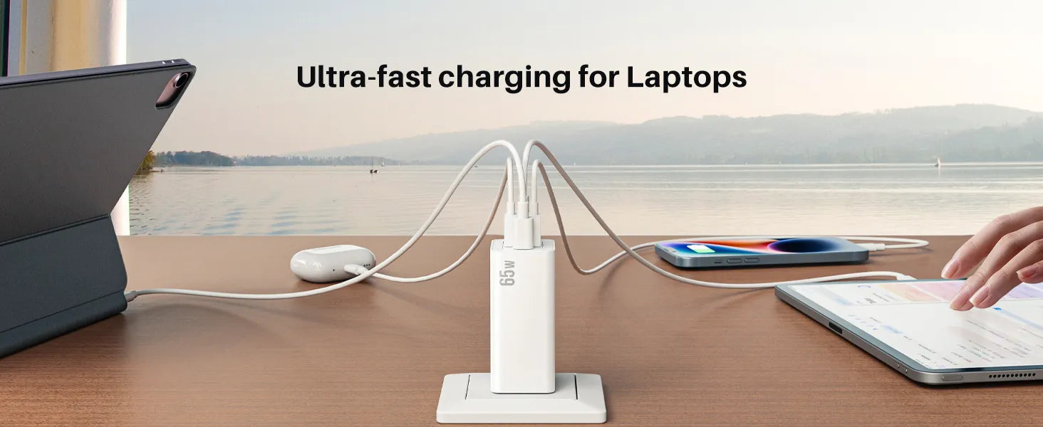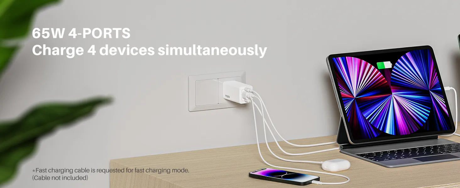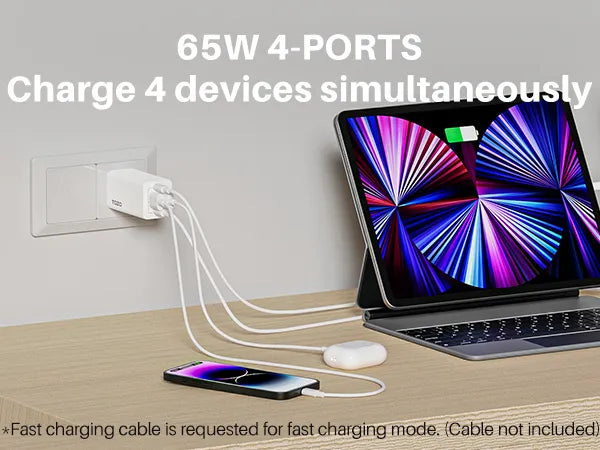 High-Efficiency with Multi USB Port Wall Charger:Powerful 65W PD output for fast charging. Charge up to 4 devices simultaneously.