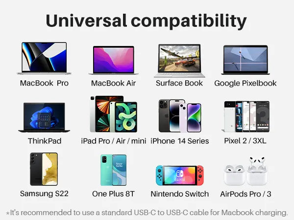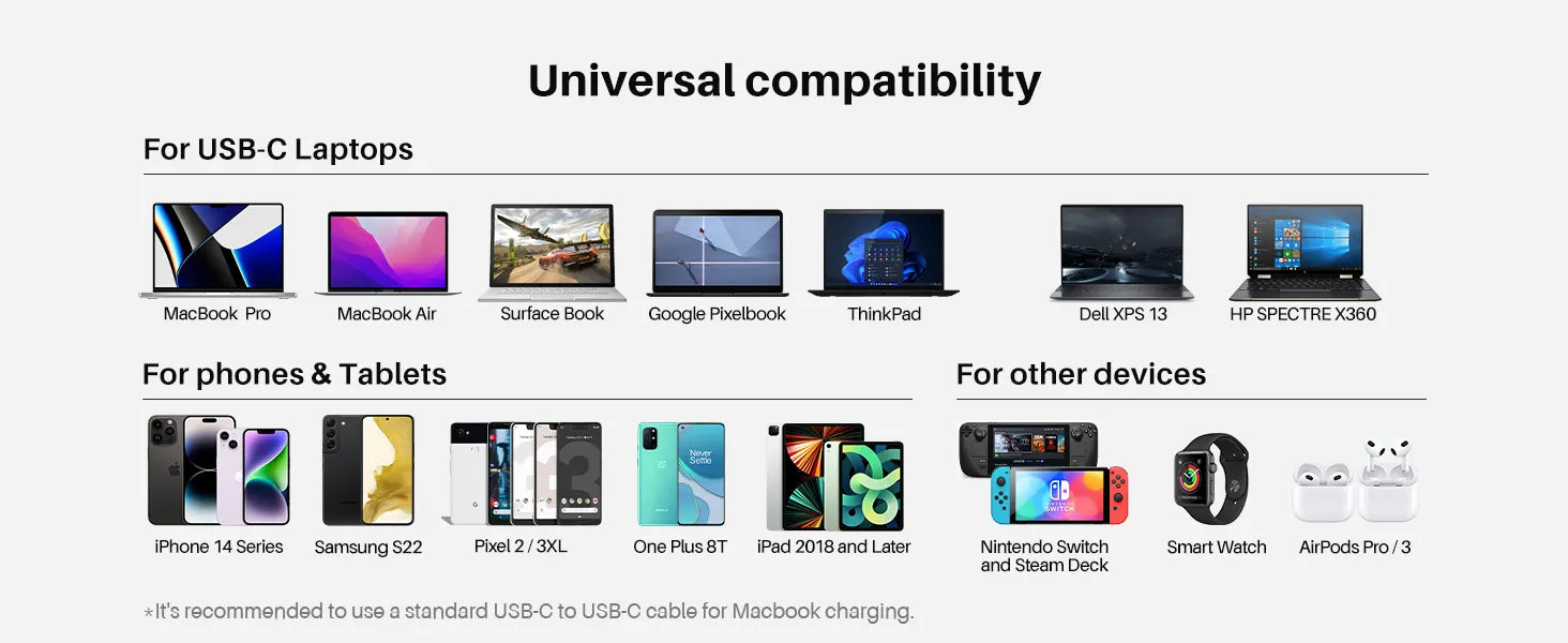 Highly Compatible: The Charger is compatible with Steam Deck/Laptops/Tablets/iPhone 14/14 Pro/14 Pro Max/13/12/Mini/ Pro/Pro Max/XS/XS Max/XR/X/11/11 Pro/11 Pro max/8 Plus/8/7/6; Samsung Galaxy S Series/Note Series; LG V60/V50/G8/G7; Google Pixel Series; MacBook Air; MacBook Pro/MacBook/iPad Pro; iPad Series Airpods/Airpods Pro; Surface Pro 7/HP Stream 14"/Omen 17/Envy 13t/Spectre x360 13t; DELL Latitude 7380/XPS 13/16; ASUS ROG Zephyrus G14/Zenbook13/14/15/flip 15/TUF A15/Vivobook 14/15/17.