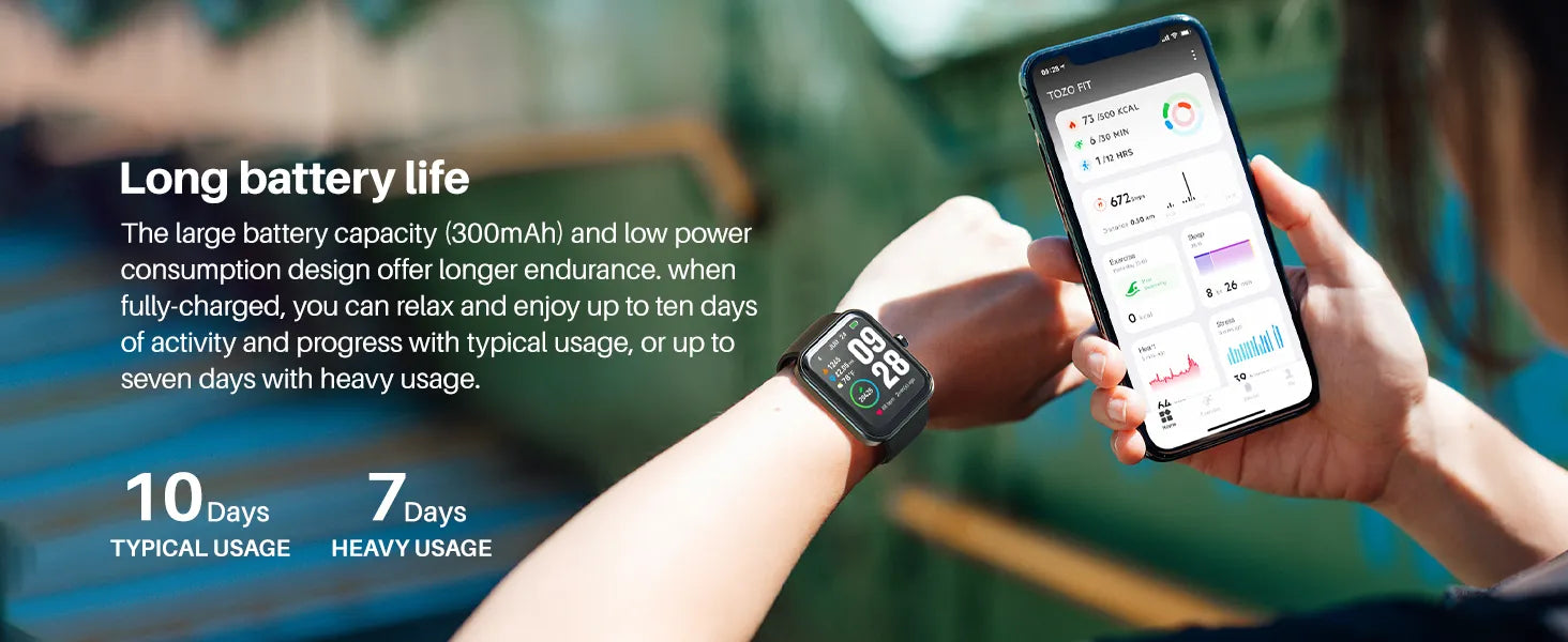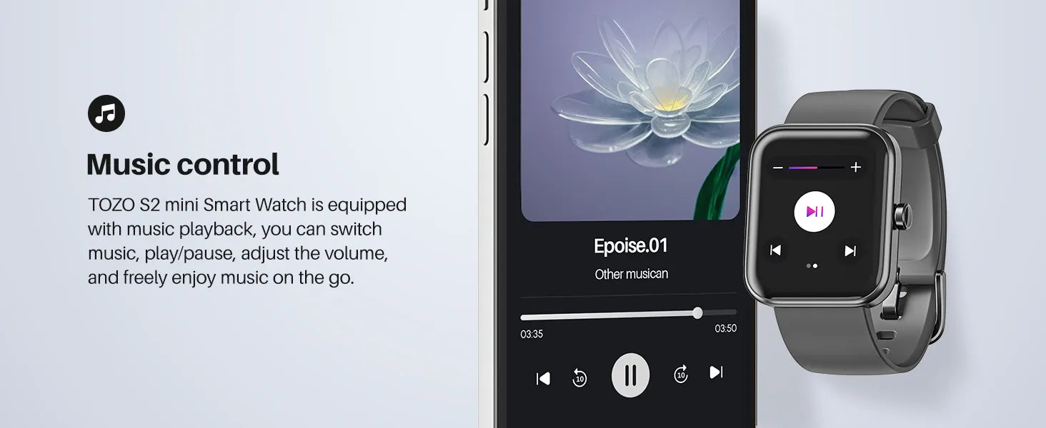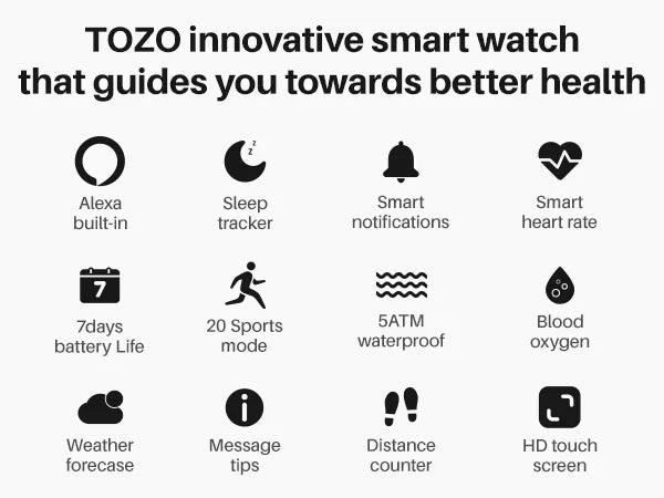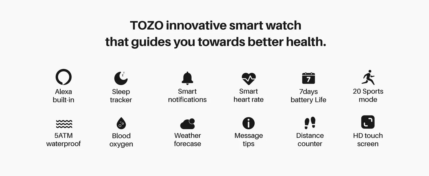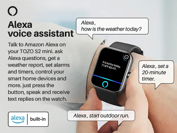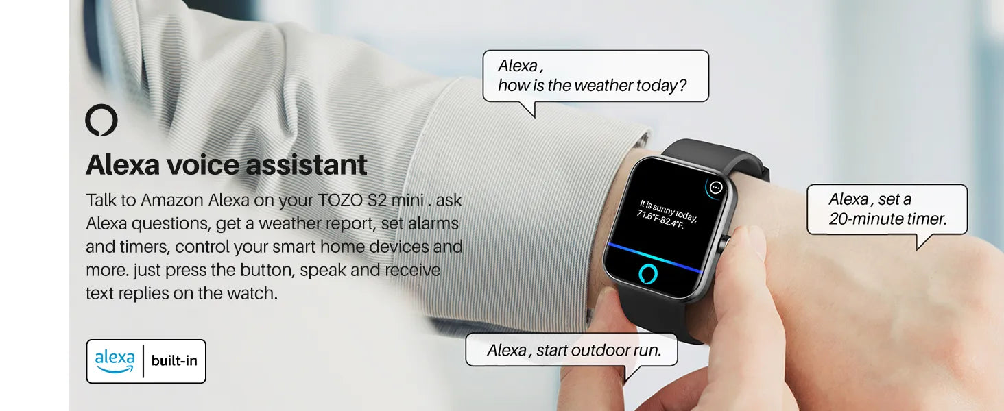 Alexa Built-in: Talk to Amazon Alexa on your TOZO S2 mini. Ask questions, play music, check the weather, set alarms, and more by speaking to your watch.