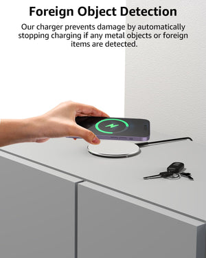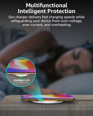 【Sleep-Friendly LED Indicator and Safe to Use】The wireless charger will light up blue for 10 seconds and then turn off during charging, quietly uses LED lights to display charge status, allowing undisturbed sleep with no notification sounds. With built-in protections against over-voltage, over-temperature, over-current, short-circuit, and other potential hazards, it keeps your device's battery safe from overcharge damage.